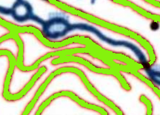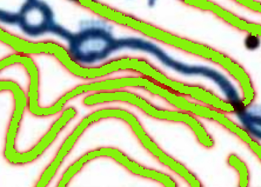 Выполнив бинаризацию оттенков коричневого цвета, получаем внедренный растр, при осмотре которого можно заметить, что он требует некоторого редактирования. В областях с большой плотностью горизонталей происходит слияние растровых линий (рис. 6), и программа вряд ли сможет самостоятельно разобраться в этой мешанине.