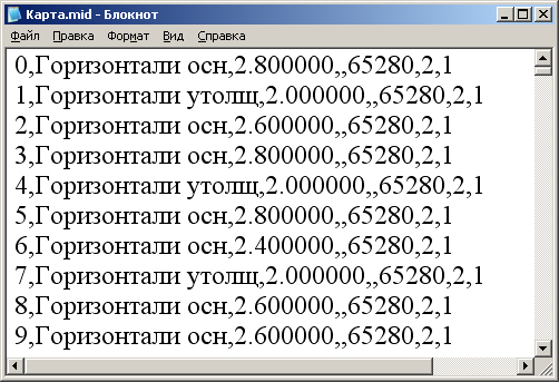Подобная информация записывается в MID-файле (рис. 12). В третьей колонке этого файла содержатся значения уровней, подлежащие исправлению. Исправляем мы их в Microsoft Excel, но сохранять исправления приходится жонглируя форматами и бдительно следя за тем, чтобы в качестве разделителей оставались запятые, а в качестве десятичных разделителей – точки. Если кто-то сможет предложить более простой способ – пишите автору на e-mail mark@tbg.burgaz.gazprom.ru, буду очень благодарен. Пользователям AutoCAD, столкнувшимся с такой ситуацией, посоветую разве что указывать увеличенное значение при задании уровня объекта в Spotlight. Это довольно неудобно, но исправлять уровень каждого объекта из AutoCAD еще неудобнее.