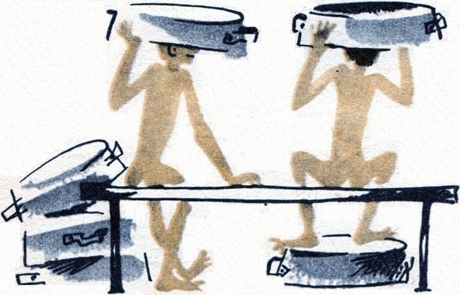 Но тут мы увидели, что в зал входит тот лысый человек, которого мы спрашивали, что он здесь делает, и с ним еще трое молодцов в халатах.