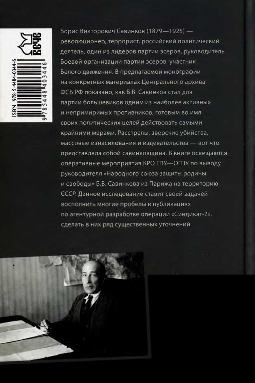 Савинков Борис Викторович (1879–1925) – один из лидеров партии социалистов-революционеров (ее член с 1903 г. по сентябрь 1917 г.), писатель (литературный псевдоним В. Ропшин). В 1903–1906 гг. являлся членом боевой организации эсеров, был одним из организаторов террористических актов – убийства министра внутренних дел В.К. Плеве, великого князя Сергея Александровича. Во время Первой мировой войны – оборонец, доброволец французской армии. Летом 1917 г. вернулся в Россию. После Октябрьской революции непримиримый враг большевиков, организатор антибольшевистских вооруженных выступлений. В результате чекистской оперативной игры «Синдикат-2» завлечен на территорию СССР и в августе 1924 г. арестован. Осужден к расстрелу, замененному лишением свободы на 10 лет. Покончил жизнь самоубийством, выбросившись из окна пятого этажа здания ОГПУ.