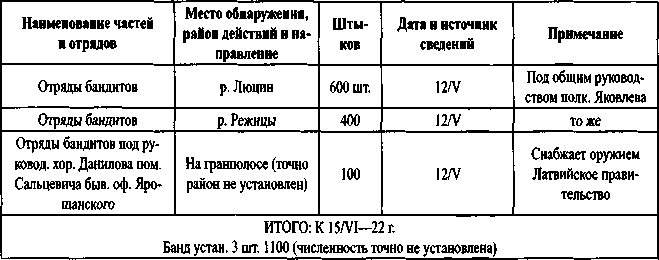 Боевое расписание вооруженных сил бандитов на территории Латвии по состоянию на 15 июня 1922 г.