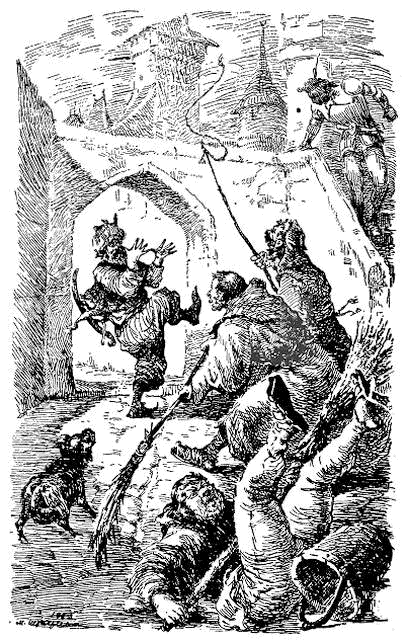 Кара, накладена на злочинця, незважаючи на всі погрози пріора, була скоріше смішна, ніж страшна. Циган бігав по двору, сповненому лемептом і лясканням батогів, ухиляючися від ударів, з яких одні не досягали його, бо навмисне не були націлені, інші, щиро призначені для його особи, не влучали, бо циган був дуже меткий, а ті, що падали йому на спину й плечі, він приймав без скарг і зойків. Галас, збентеження й безладдя були тим більші, що ченці, недосвідчені в таких справах, били один одного частіше, ніж самого Хайреддіна. Нарешті, бажаючи покласти край видовищу, яке було більш скандальне, ніж повчальне, пріор звелів відчинити хвіртку, і циган, блискавкою проскочивши у неї, кинувся геть і зник.