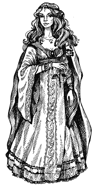 За почесним столом, у верхньому кінці зали, відчинилися бічні двері, й на поміст зійшла леді Ровена в супроводі чотирьох служниць.