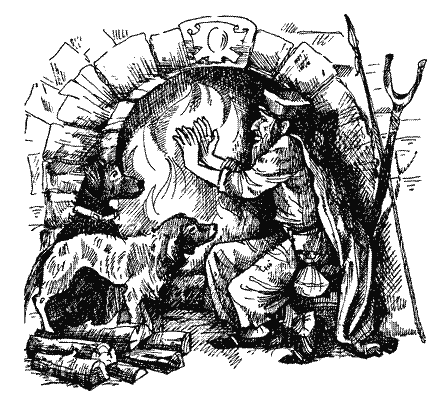 Якби в ті часи існували живописці, здатні передати такий сюжет, фігура цього єврея, який схилився перед вогнем і зігріває над ним свої закляклі й тремтячі руки, могла б послужити їм гарною натурою для зображення зимової пори року. Трохи відігрівшись, він із жадібністю взявся до паруючої юшки і поглинав її так поквапно і з такою насолодою, ніби давно не куштував їжі.