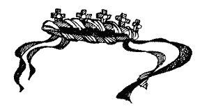 Лицар скорився, і принц Джон поклав на кінець списа вінець із зеленого атласу, окільцьований золотим обручем, прикрашеним зубцями у вигляді сердець і наконечників стріл, на кшталт того, як герцогська корона облямована суничним листям, яке чергується з кульками.