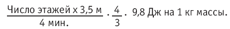 Наиболее простым и безопасным способом контроля является использование лестницы. Если принять нагрузку при подъеме за 100 %, то при спуске она составит 30 % этой величины. Следовательно, три этажа подъема со спуском нужно считать за четыре этажа. Задание состоит в том, чтобы «работать» 4 минуты, поднимаясь на 1–2 этажа и снова спускаясь, потом остановиться и сосчитать пульс. За эти 4 минуты можно пройти 5 этажей или, например, 20. Высота этажей, считая от площадки до площадки, в современных домах колеблется от 3 до 4 м, примем ее в среднем за 3,5 м. Рассчитать работу, выраженную в джоулях, помня, что 1 кгм = 9,8 Дж, не составит труда. Спуски учитываем умножением на 4/3. Таким образом, формула расчета работы составляет: