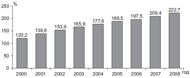 Рис. 1.9. Индекс потребительских цен в России, в % к уровню 1999 г.