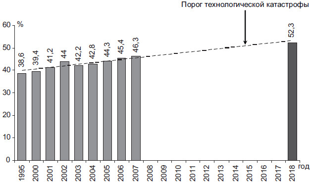 Принято считать, что степень изношенности до уровня в 25 % – это допустимая норма, в диапазоне с 25 до 50 % – состояние критическое, а свыше 50 % – ситуация техногенных катастроф. Применительно к стране – это состояние «разрухи» [15] . Современная Россия находится уже в непосредственной близости от данной черты. При сохранении существующих тенденций 50-процентный показатель будет превышен не позже 2014 г. Если не будет срочно включена политика фондовосстановления, начнутся технологические сбои функционирования многих инфраструктурных механизмов (рис. 1.10).