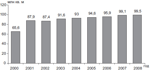 Об усиливающейся в 2000-е гг. тенденции деградации свидетельствует, в частности, статистическая динамика состояния жилищного фонда. Объемы жилых площадей, находящихся в ветхом и аварийном состоянии, за последнее десятилетие устойчиво возрастали. Идет, казалось бы, активное строительство нового жилья. Но оно предназначено в основном отнюдь не для переселения той части населения, которая проживает в зданиях трущобного типа (рис. 1.11) [16] .