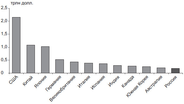 Тезис об успешности инвестиционной политики Российской Федерации дезавуируется также при рассмотрении ее показателей в мировом страновом сопоставлении. Россия по инвестициям в основной капитал существенно отстает от ведущих экономик мира (рис. 1.13). Ее позиция по этому параметру оказывается даже хуже, чем по страновому рейтингу ВВП. Группа стран (Индия, Южная Корея, Австралия), имеющих более низкие показатели по валовому внутреннему продукту, опережают Россию по масштабам инвестиционных поступлений. А ведь именно инвестиции тянут за собой экономику. Следовательно, с очевидностью можно предсказать, что место России в мировом рейтинге национальных экономик скоро понизится.