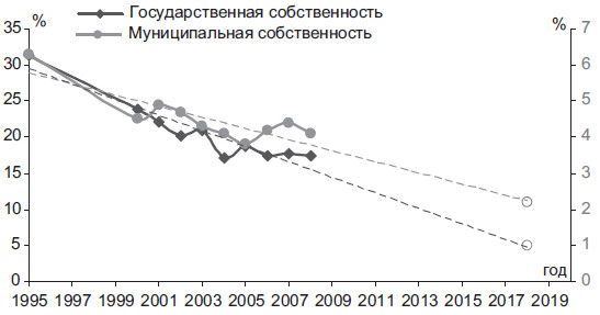 Принципиально важно, как распределяются инвестиционные потоки в России. Обнаруживается, что доля государственной и муниципальной сферы в общем инвестиционном пакете за рассматриваемый период резко сокращалась. При сохранении сложившегося положения к 2018 г. государство будет капитализировать не более 5 % всех инвестиций.