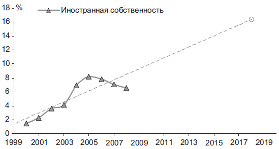 И наоборот, в результате сложившегося перераспределения все более возрастает доля в совокупном инвестировании находящихся на территории России иностранных компаний. К 2018 г. они по уровню инвестиционных вложений фактически троекратно обгонят российскую государственную сферу. Показатели инвестиционных успехов оказываются в значительной мере не более чем инвестированием иностранного капитала и группировки олигархата (рис. 1.14) [19] .