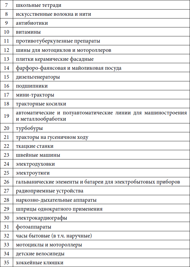 Снижение показателей за период с 2000 г. по 2008 г. произошло в следующих видах производства: говядина и телятина; мука; хлеб; сахар-песок; сахар-рафинад; шерстяные ткани; льняные и льно-джутовые ткани; шелковые ткани; трикотажные изделия; пальто и полупальто; платья; сорочки; текстильные и швейные товары детского ассортимента; кожтовары; валяная и фетровая обувь; оконные блоки; обои; школьные тетради; зубная паста; искусственные волокна и нити; синтетические волокна и нити; антибиотики; витамины; препараты для лечения сердечно-сосудистых заболеваний; болеутоляющие, жаропонижающие и противовоспалительные средства; противотуберкулезные препараты; шины для мотоциклов и мотороллеров; стеновые блоки; шифер; плитки керамические фасадные; фарфоро-фаянсовая и майоликовая посуда; белая жесть; холоднотянутый сортовый прокат (включая подшипниковый прокат); лента стальная холоднокатаная; дизели и дизельгенераторы; подшипники; мини-тракторы; тракторные косилки; металлорежущие станки; автоматические и полуавтоматические линии для машиностроения и металлообработки; турбобуры; автогрейдеры; тракторы на гусеничном ходу; ткацкие станки; швейные машины; электрочайники; электродуховки; электроутюги; электродвигатели переменного тока; взрывозащитные электродвигатели; настольные электролампы; люстры и подвесы; торшеры; гальванические элементы и батареи для электробытовых приборов; радиоприемные устройства; наркозно-дыхательные аппараты; шприцы однократного применения; электрокардиографы; фотоаппараты; часы бытовые (в том числе наручные); мотоциклы и мотороллеры; детские велосипеды; хоккейные клюшки. Список на самом деле далеко не полный, но ярко отражает результат реформы. Страна многое импортирует. Жизнеспособность такой страны падает.