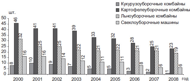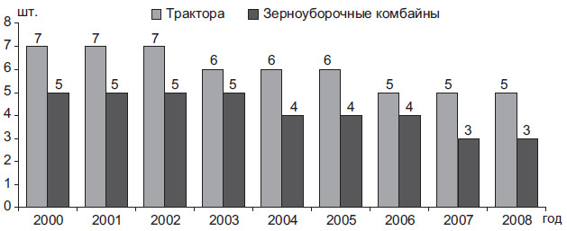 Рис. 1.16. Обеспеченность сельскохозяйственных организаций тракторами и комбайнами, шт. на 1000 га