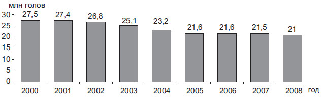 Та же оценка может быть дана в отношении высоких показателей урожайности зерновых конца 2000-х гг. Общего глубинного состояния аграрного сектора они не отражали. В животноводстве, например, в те же самые годы никакого значимого подъема не наблюдалось. Более того, на протяжении всех 2000-х гг. в России происходило устойчивое сокращение поголовья крупного рогатого скота (рис. 1.17)19. На неизменном уровне осталось только поголовье свиней. Снизился совокупный удой молока. Сократился среднегодовой настриг овечьей шерсти.