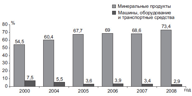 При этом синхронно уменьшалась доля статьи, включающей машины, оборудование и транспортные средства и считающейся индикатором технологического развития. Сокращаемое производство собственных машин замещалось импортом иностранной техники. Удельный вес данной статьи в структуре импортируемых товаров из стран дальнего зарубежья за 2000-е гг. резко возрос, превышая половину всех производимых поставок (рис. 1.19) [25] .