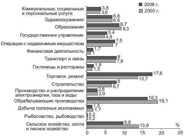 Показательны изменения, произошедшие за десять лет в структуре занятости населения. В 2000 г. больше всего россиян было трудоустроено в сфере обрабатывающего производства, на второй позиции находилось сельское хозяйство. Теперь первую строчку занимает сервисная группа, объединяющая торговлю и ремонт. По доле торговцев Россия превосходит сегодня любую из западных стран. Неоправданно объединенные в классификаторах с торговлей ремонтные профессии при этом структурного роста соответствующей статьи не определяли. Помимо обрабатывающего производства и сельского хозяйства снизили свое удельное значение добыча полезных ископаемых; производство и распределение электроэнергии, газа и воды, образование.