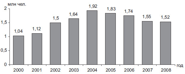 Продолжился начатый в 1990-е гг. тренд деградации российского образования. Основу его составил процесс тотальной коммерциализации российской образовательной системы. Результатом перевода на коммерческую основу явилась ликвидация нерентабельных учреждений. А о какой рентабельности детского сада, школы или профессионально-технического училища можно говорить применительно к российской провинции? Развитие там образовательных инфраструктур определялось в советское время соображениями стратегического характера. Теперь вопросы стратегии, очевидно, не берутся в расчет. В 2000-е гг. последовательно велось сокращение численности дошкольных образовательных учреждений. Соответственно, произошло итоговое уменьшение численности работающего в них персонала педагогических кадров. Демографические причины здесь не играют роли. Численность детей, приходящихся на соответствующее количество мест, устойчиво возрастала. Сохранившиеся детские сады оказались в итоге переполнены, нормы ясличных и детсадовских групп перекрыты (рис. 1.32-1.33)31.