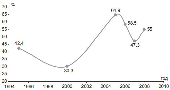 По некоторым регионам положение по показателю занятости населения ухудшилось в 2000-е гг. и стало ниже всех возможных критических порогов. Так, в Ингушетии безработные составляют более половины экономически активного населения республики. В 2000 г. их было менее трети. Война на Кавказе, как говорят, закончилась, деньги на трудоустройство населения кавказских республик исправно выделяются, а безработица при этом резко возросла (рис. 1.22) [29] . Следует ли удивляться непрекращающемуся пополнению рядов боевиков-террористов, если потенциальная база терроризма из числа безработного населения измеряется такими масштабами, как в Ингушетии.