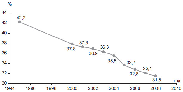 Рис. 1.26. Средний размер назначенных пенсий в России по отношению к среднему размеру начисленной заработной платы (коэффициент замещения)