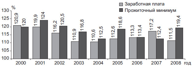 Рис. 1.25. Соотношение роста реальных начислений заработной платы и роста прожиточного минимума, в % к предыдущему году