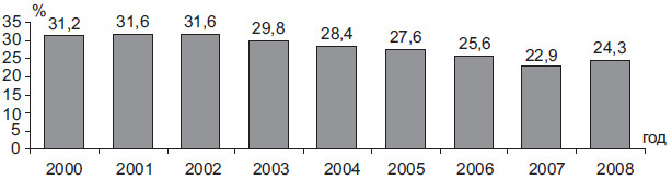 На протяжении всего десятилетия 2000-х гг. в качестве злободневной темы рассматривался вопрос об осуществлении пенсионной реформы. Достигнутые успехи позиционировались едва ли не как спасение российских стариков. Но каков критерий успешности? Улучшился ли реально социальный статус пенсионеров? Представление об успешности проведенной реформы сразу же рассыпается при сопоставлении размера среднедушевой пенсии в России с величиной средней заработной платы (средний коэффициент замещения). За 2000-е гг. это соотношение устойчиво снижалось. В общероссийском отношении положение пенсионеров, таким образом, за истекшее десятилетие не улучшилось, а, напротив, оказалось ниже исходных рубежей (рис. 1.26) [31] .