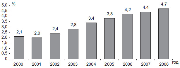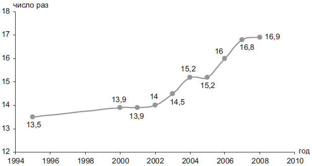 Причем, прежде всего этот рост касается корзины потребления беднейших слоев населения. За 2000–2008 гг. средние цены возросли: на говядину и свинину– в 3,3 раза; кур – в 2,0; колбасу – в 2,7; рыбу – в 3,0; рыбные консервы – в 2,0; сливочное масло – в 3,2; молоко – в 2,9; сыры – в 2,5; яйца куриные – в 2,4; сахар-песок – в 1,5; чай – в 1,9; муку пшеничную – в 2,7; хлеб и булочные изделия – в 3,0; рис – в 3,4; макаронные изделия – в 2,6; картофель – в 3,2; капусту – в 2,5; лук – в 2,7; яблоки – в 2,6; пальто женское – в 2,5; костюм мужской – в 2,4; рубашку мужскую – в 2,3; джемпер мужской – в 2,5; туфли мужские – в 2,1; туфли женские – в 2,0; сапоги женские – в 1,9; бензин – в 2,4; кирпич – в 4,5; капли корвалола – в 1,9; кольцо обручальное – в 2,5; химчистку – в 3,8; стирку белья – в 4,9; стрижку в женском зале – в 4,4; рытье могилы – в 4,7; изготовление гроба – в 3,3; проезд в городском муниципальном автобусе – в 4,0; проезд в метро – в 3,4; плату за муниципальное жилье – в 8,8; водоснабжение и канализацию – в 9,5; отопление – в 9,4; газ сетевой – в 5,3; электроэнергию – в 4,2; билет в кинотеатр – в 5,8; билет в театр – в 6,2; посещение детского сада – в 4,9; проживание в санатории – в 3,8; первичный прием у врача – в 4,0; общий анализ крови – в 3,9; покупку жилья на первичном рынке – в 6,1, на вторичном – в 8,6 раза (по Москве, соответственно, в 7,8 и в 10,1 раза) [14] . Рост зарплат при этом значительно отставал от этой динамики (более детально см. далее). Принципиально ниже были и цены производителей, что прямо указывает на спекулятивный фактор ценообразования.