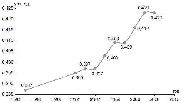 Проблема обеспечения социального равенства вообще отсутствует в риторике современной государственной власти. Такое отношение более всего свидетельствует о сохранении либеральной ценностной парадигмы властно-управленческой команды. Между тем, уровень дифференциации доходов населения входит в зону, генерирующую социальные неустойчивости. За 2000-е гг. происходил устойчивый рост как коэффициента фондов (дифференциация доходов 10 % самых богатых и 10 % самых бедных), так и коэффициента Джини (степень отклонения от равномерного распределения доходов). К 2010 г. Россия оказалась более социально поляризованной, чем это было в 1990-е гг. А поляризация, как известно из истории, становится часто основанием революции (рис. 1.27-1.28) [32] .