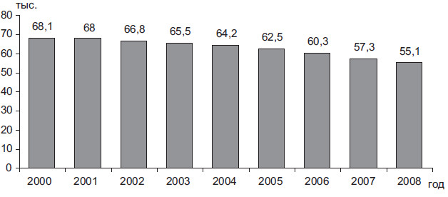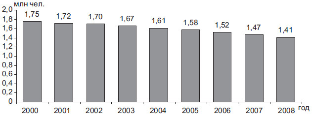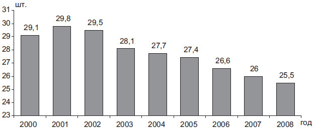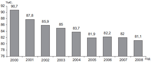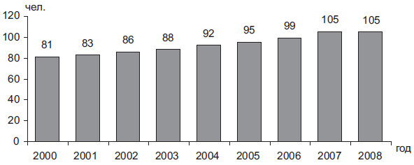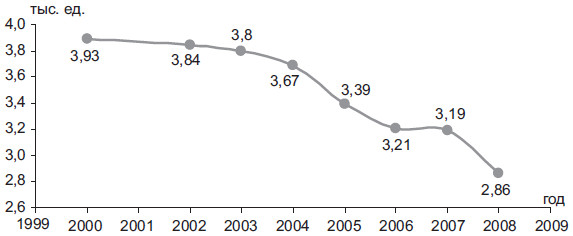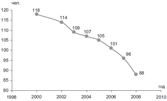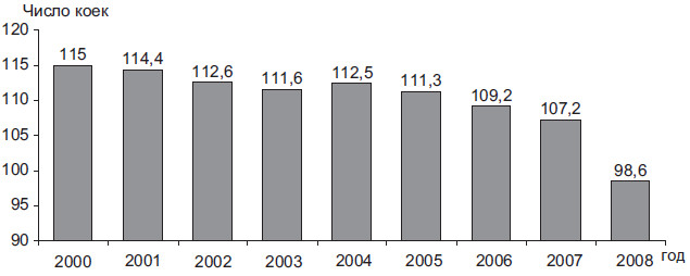 Устойчивый спад происходил за истекшее десятилетие по показателю численности больничных коек на условную группу населения (рис. 1.40) [38] .