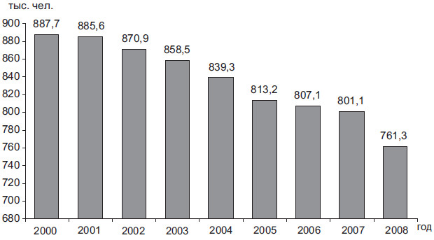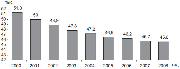 Аналогичный процесс ликвидации «нерентабельных» учреждений происходил в 2000-е гг. в сфере среднего образования. В сельской местности за десять лет оказалось ликвидировано более 10 тыс. школ. Устойчиво сокращалась численность учительского контингента. Все разговоры о повышении социального статуса школьного учителя оказались на поверку бессодержательны (рис. 1.34-1.35) [34] . Впрочем, справедливости ради надо признать, что ситуация с несколькими учениками на школу, рассчитанную на сотни учащихся, в действительности имеет место.