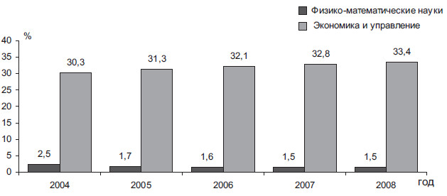 Показательно в данном случае сопоставление удельного веса выпуска по специальностям физико-математического и экономического профиля (рис. 1.38) [36] . Когда-то, в период научно-технического прорыва СССР, направления физики и математики были наиболее популярными. В 2000-е гг. их популярность последовательно снижалась. Для массового восприятия эти специальности оказались лишены ореола коммерческой успешности. Вместе с тем, происходил стремительный рост экономистов. Диплом по этому направлению получает каждый третий из российских выпускников вузов. Парадоксальность сложившейся ситуации состоит в том, что привлекательность экономических специальностей росла параллельно с процессом сырьевой структурной деградации самой экономики.