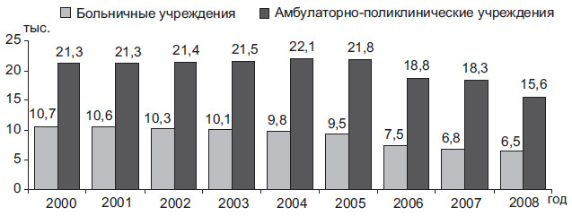 Рис. 1.39. Численность больничных и амбулаторно-поликлинических учреждений в России