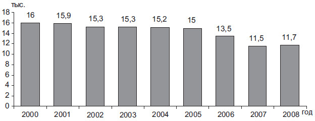 Причем парадоксально, но со стартом национального проекта «Здравоохранение» динамика падения заметно возросла. Явно не соответствует демографическим задачам, сформулированным Правительством РФ, устойчивое снижение в 2000-е гг. числа коек для беременных женщин и рожениц; числа женских консультаций; детских поликлиник и амбулаторий; фельдшерско-акушерских пунктов (рис. 1.41-1.43) [39] . Системность происходящей по этому направлению деградации говорит о декларативности кампании по защите материнства и детства.