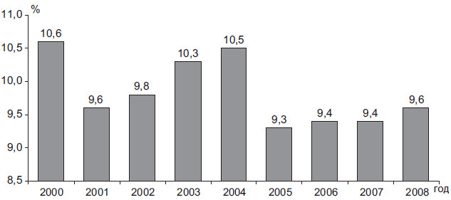 Некоторое снижение показателя смертности за несколько последних лет также является минимальным. Совокупный коэффициент смертности остается выше, чем в 1990-е гг., не говоря уже об уровне, отмечаемом в советское временя (рис. 1.6) [11] .