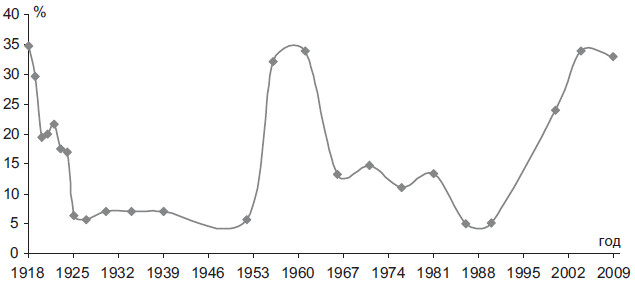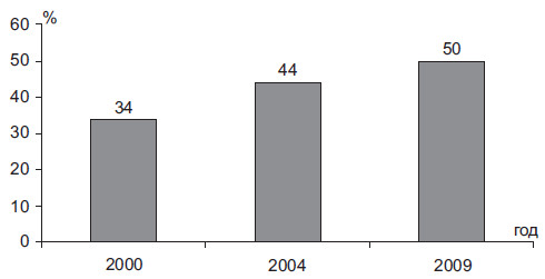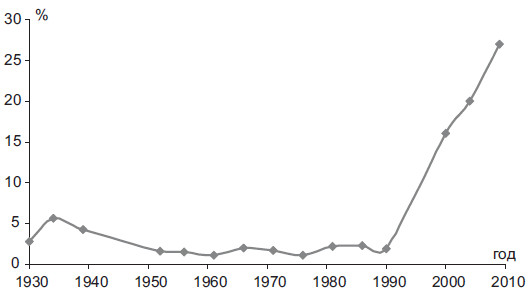 Еще более впечатляющим является рост представительства в высшей политической власти лиц, деятельность которых связана с банковскими структурами и крупным бизнесом. Уже к 2000 г. оно составляло более трети состава российского правящего класса. К 2010 г. этот показатель и вовсе достиг половины всего истэблишмента. Несмотря на реляции о победе над олигархическим капитализмом образца 1990-х гг., подлинный облик власти позволяет констатировать прямо противоположную тенденцию. Финансовая олигархия составляет сегодня реальность современного функционирования и кооптирования российской власти (рис. 2.4).
