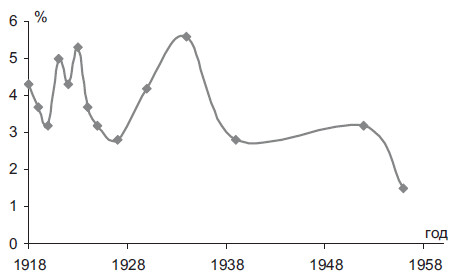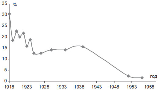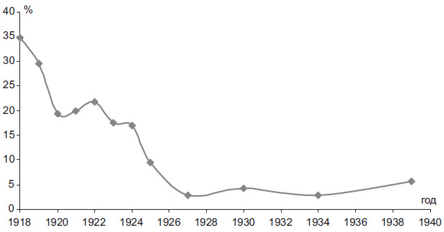 Революционная элита в подавляющем большинстве своем была представлена национальными меньшинствами. Их удельный вес в ЦК превышал первоначально две трети состава. Даже после окончания Гражданской войны он все еще превышал половину численного состава членов Центрального Комитета. Тезис о том, что существенную роль в революции в России сыграли «нерусские», находит, таким образом, прямое статистическое подтверждение. Особенно очевидным статистически являлось существование еврейской и латышской политической клановости. Удельный вес евреев и латышей в ЦК явно диссонировал с их представительством в общей численности населения (рис. 2.6–2.7). В сталинский период представительство национальных меньшинств в государственной политической элите СССР заметно снижается. К концу правления И.В. Сталина оно в 2,3 раза было меньше, чем в начальной революционной точке советского элитообразования. Четко фиксируется перелом, произошедший во второй половине 1930-х гг., после которого доля представительства национальных меньшинств в политической элите начала резко сокращаться.