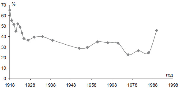 Другой проверяемый посредством методики биографических совпадений показатель характеризует представительство национальных меньшинств на высшем уровне государственной власти. Временной интервал анализа ограничивался при этом советским периодом истории. Данное ограничение связано с наличием эмпирической информации. Анкетные данные в СССР включали, как известно, графу о национальной принадлежности («пятый пункт»). Именно эта самоидентификация представителей ЦК по партийным анкетам и послужила основанием для расчета удельного веса различных национальностей в советской политической элите [61] . Проблема скрываемой национальной принадлежности в данном случае, ввиду неявности идентификаций, выводилась за скобки. Между тем, необходимо признать, что она действительно существовала. Типичным случаем являлось использование рядом представителей национальных меньшинств по конъюнктурно-карьерным соображениям анкетной идентификации – «русский». Т. е. по этому признаку возможна оценка только «снизу». Она, как понятно, является более надежной.