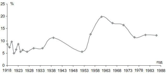 Современные клановые инкорпорации в политическую элиту не ограничиваются петербургским представительством. Известным современным феноменом является широкое введение на уровень высшей власти бывших и действующих представителей органов госбезопасности и силовых правоохранительных структур. Их удельный вес в современной политической элите находится на беспрецедентно высоком уровне, превышая четверть всего истэблишмента. Доля представительства указанных ведомственных кланов пятикратно превышает показатели сталинского периода. Характерно также то, что удельный вес соответствующего клана сохраняет тенденцию роста, увеличившись за 2000-е гг. на 11 % (рис. 2.3).