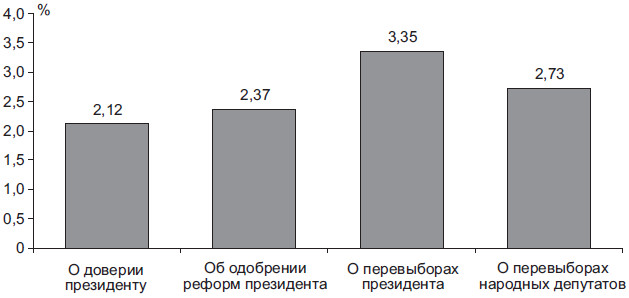 Особо показательна статистика «недействительных бюллетеней». Наиболее критичная для Б.Н. Ельцина позиция была по вопросу перевыборов президента. Только 0,5 % голосов не хватило для негативного для него вердикта. И именно по этому показателю фиксируется наибольшее количество испорченных бюллетеней. Оно заметно диссонирует с соответствующими показателями по другим статьям опроса. А, как известно, одного лишнего значка достаточно, чтобы бюллетень стал недействительным. Возник парадокс: 58,7 % доверяют президенту, но при этом 49,5 % требуют его перевыборов (рис. 3.4) [90] .