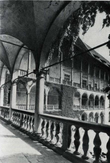 Прекраснейший фрагмент замка – его внутренний дворик, замкнутый четырьями крыльями дворцовых зданий. Дворик окаймлен тройной гирляндой галерей, легко и ритмично разделенных воздушной конструкцией чередующихся опор, арок и баллюстрад. Каждый ярус – иной высоты, но пропорции найдены настолько удачно, что весь дворик пронизывает ощущение совершенной гармонии и легкости. Стройные колонны первого и второго яруса поддерживают полукруглые арки мягких, плавных очертаний. Колонны третьего этажа, репрезентативного «piano nobile» обращают на себя особое внимание. Неожиданно тонкие, как бы нарочно удлиненные, чтобы дотянуться до навеса крыши, который они поддерживают, – они кажутся перевязанными нарядной ажурной ленточкой. На самом деле примерно на середине высоты каждая колонна перехвачена своеобразной балясинкой в форме кувшина – тем самым достигается впечатление и стройности колонны и ее прочности, так как иначе она казалась бы слишком хрупкой. Такой прием понадобился архитекторам неспроста: надо было и создать зрительный акцент на репрезентативном этаже, и увеличить его высоту, и сделать доступной для обозрения роспись фриза на внешней стене галереи, выполненную в 1536 году живописцем Дионисом Стубой из Вроцлава. Фрагменты росписи, изображавшей портреты римских императоров в медальонах, растительные орнаменты и декоративные композиции на античные темы сохранились и поныне на стенах южного и восточного крыла замка. Нарядные галереи, богатая резьба порталов и балюстрад, медные кованые водостоки в виде драконов, раскрашенные колонны, лестницы, сбегающие с галерей прямо во двор, наконец, все это обилие форм, красок и линий создавало картину чрезвычайно живописную и пленительную. Галереи играли не только репрезентативную роль, но и функциональную, соединяя этажи и комнаты (кстати, последние отапливались печами, топили которые снаружи, с галереи). Наконец, галереи служили также просто-напросто местом встреч и ожиданий. А самый двор не раз бывал огромной сценой для проходивших здесь турниров и придворных празднеств.