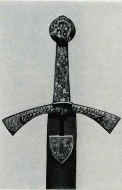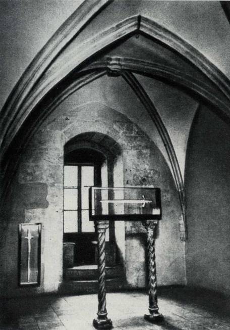 Сегодня в старинных готических залах королевской сокровищницы, где своды скрепляют замковые камни с гербами Ягеллы и Ядвиги, снова по традиции разместились королевские регалии и драгоценности – на сей раз в музейной экспозиции. Вот знаменитый Щербец – коронационный меч польских королей, который традиция связывает еще с Болеславом Храбрым. И хотя историки впервые называют его лишь в связи с коронацией на Вавеле Владислава Локетка, о чем напоминает готический щит с орлом Пястов на острие меча, – все же молчаливым доказательством более древнего происхождения меча остается романская гравировка на его рукоятке. Рядом – изысканно орнаментированный, золоченый ренессансный меч Зигмунта Старого, которым король посвящал в рыцари. Громадная хоругвь с государственным гербом Польши-также немой свидетель коронаций польских королей– единственная из богатств сокровищницы, не покидавшая Вавель в годы гитлеровской оккупации и остававшаяся все это время в надежном укрытии.