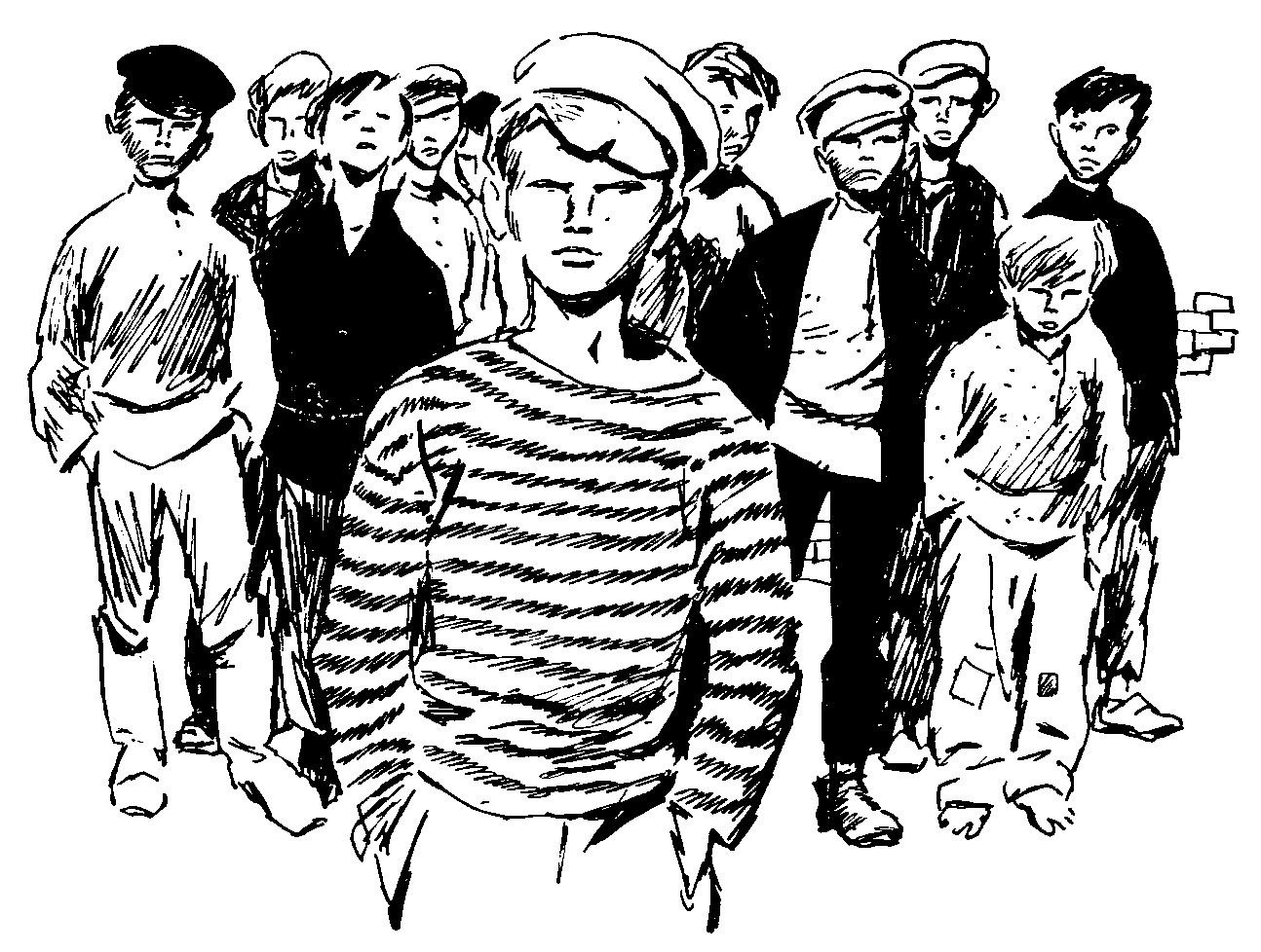Ванюшка с завистью в глазах и с невольным трепетом на сердце смотрел, как этот оборвыш Типка водил со двора на улицу и обратно ватагу ребят, человек сто, наверное, не меньше. Шагал он, как полководец, впереди развалистой моряцкой походкой в своей неизменной полосатой тельняшке, в длинных, до пяток, брезентовых штанах, туго подпоясанных рыжим огрызком ремня, и в небрежно заломленном набекрень картузе с рваным козырьком. За ним послушно тянулись такие же, как и он, оборванные, чумазые, вихрастые, босоногие ребята, оглушая встречных многоголосым свистом и криком.
