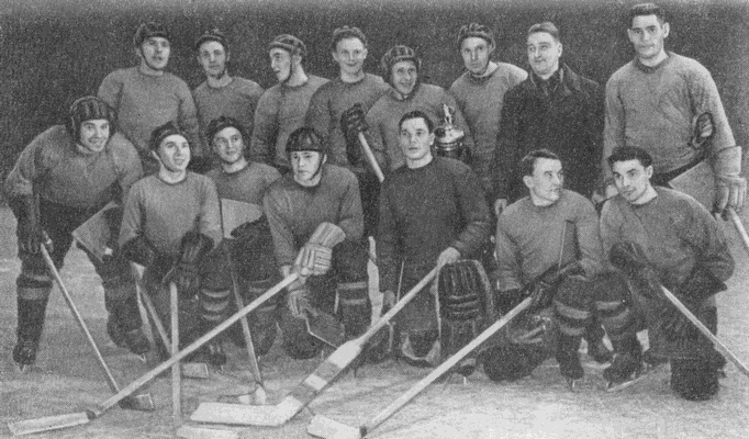 Команда ЦДКА – чемпион Советского Союза 1948 года по хоккею с шайбой. На снимке (слева направо): В. Никаноров. Г. Мкртычан. М. Орехов, Е. Бабич, А. Тарасов, В. Бобров и В. Веневцев (фото А. Волкова)