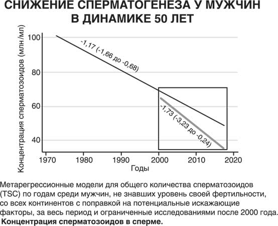 Таким образом, если снижение будет продолжаться в наметившемся темпе, к 2030–2040 годам средняя концентрация будет приближаться к 40 млн/мл, что является критическим значением в плане развития мужского бесплодия. Это подтверждается резким нарастанием «мужского фактора» как причины бесплодия пары. Проведя параллель между уровнем тестостерона у мужчин и снижением физической силы у детей, не достигших фертильного возраста, можно предположить, что эти дети уже находятся в зоне риска.