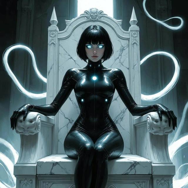 Последний зал оказался вдвое больше предыдущих, а из-под его купола лился белый мягкий свет. В дальнем конце – трон из светлого мрамора и серебра, к которому тянулись тысячи уходящих в стену позади пульсирующих энергетических щупалец. А на троне – девушка: черные волосы, смуглая кожа, пухлые губки, чуть курносый носик и горящие белым огнем глаза.