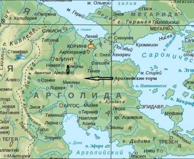 Тенейский перевал в Арахнейских горах, отделяюших Арголиду от Коринфии, – это единственный путь к Микенам с севера. Его ширина в самом узком месте – 300–400 метров. По сути, это узкая долина между отрогами гор. Сейчас по этой древней дороге проходит трасса Е65 Коринф-Аргос.