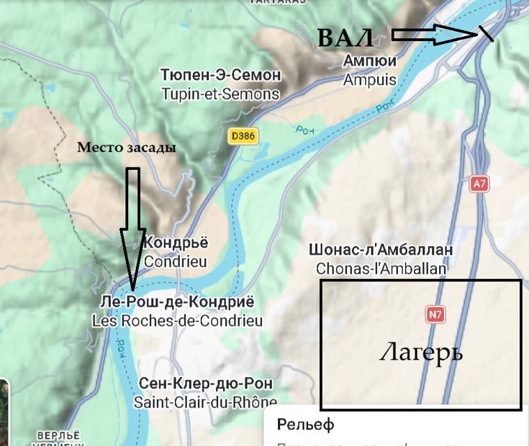 Рона в этих местах узка, шагов в двести-двести пятьдесят. Редко где больше. И прямо напротив лагеря русло делает крутой изгиб, петлей обходя возвышенность. Место это для провода судов сложнейшее. За немалые деньги в Массилии кормчего наняли, который знает здешние мели. Без него груженая баржа на стремнине может и вовсе перевернуться, или налететь на подводную скалу, коих тут без числа. Встречное течение очень сильно, а фарватер узкий(1).