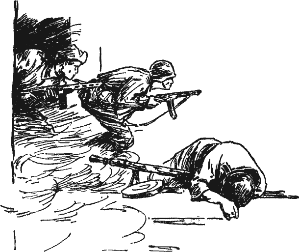 Немая картина. А в это время мы уже видим, что гитлеровцев здесь не меньше двадцати: возле каждого окна – по двое. Тут я замечаю, что один из них осторожно тянет руку к лежащей на столе гранате. Ждать больше нельзя, мы открываем огонь. Косим гитлеровцев длинными очередями. Через минуту здесь полный порядок. Но раздается стрельба в коридоре. Это выскочили гитлеровцы из соседних комнат. Коля Архипов быстро закрыл дверь, а мы с Лешей придвинули к ней два стола. Гитлеровцы из коридора начали стрелять сквозь дверь. Мы легли на пол и схоронились за столами. На выстрелы отвечаем огнем и тоже через дверь.