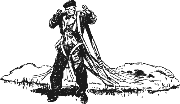 В субботу утром на аэродром приехал Гарц. В это время курсанты под руководством парашютного инструктора занимались подгонкой снаряжения. Занятие происходило на лужайке возле домика, где жили курсанты. Субботин сам проверял точность подгонки и в это время незаметно делал микроснимки каждого курсанта. Заметив мчавшуюся к домику машину Гарца, Субботин приказал курсантам построиться в шеренгу. Сделан еще один снимок – групповой.
