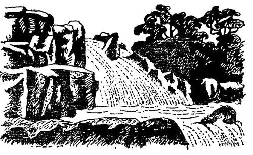 Вслед за гидом спускаемся вниз по склону, пересекаем небольшой ручей по бревнышкам и вдруг… сквозь ветви деревьев замечаем низвергающуюся огромную молочно-белую ленту воды. Видна только верхняя часть водопада. Несколько минут любуемся, потом спускаемся ниже, к пойме реки. Проходим метров сто по высокой густой траве, покрытой водяными каплями, и нашему взору открывается водопад во всем своем великолепии. До него метров сорок – пятьдесят, но его брызги обдают нас с ног до головы. Мы их не ощущаем, настолько величественным показалось зрелище. И хотя перед нами шумел не водопад Виктория[16], но он покорил нас. До сих пор не видел ничего подобного. Поток низвергается с высоты 60 метров. Вода вместе с галькой и валунами, падая с большой высоты, выдолбила у подножия уступа глубокую яму. Столб водяной пыли поднимается до середины уступа. Было пасмурно. Мы стояли, не обращая внимания на холодный душ.